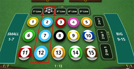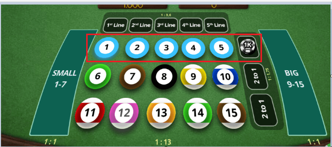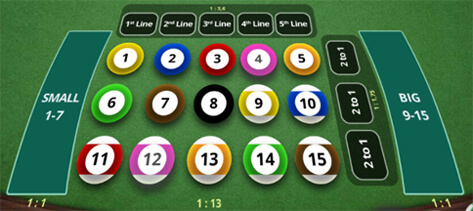 1. Bet Utama : Memilih angka dari 15 nomor bola billiard yang akan di tentukan oleh 1 bola hasil dengan pembayaran 1:14