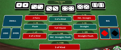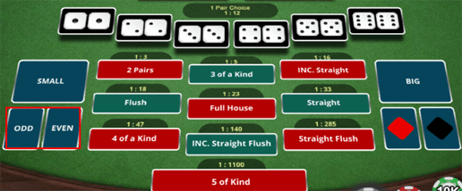 5 Of a Kind adalah menebak hasil dadu keluar dengan angka kembar sebanyak 5 dadu contoh 5-5-5-5-5 (semua angka dengan dadu kembar 5)