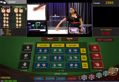 - VS Black Dice (Gunting, Batu dan Kertas) : Bettingan memilih Gunting, Batu atau Kertas yang menang di adu hanya dengan melawan hasil keluar dadu berwarna hitam.