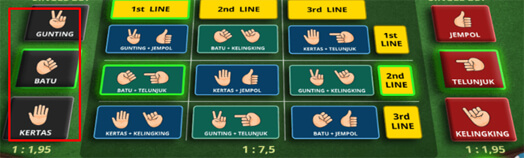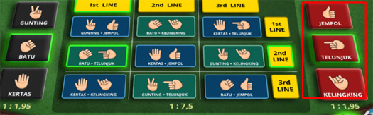 - VS Red Dice (Jempol, Telunjuk dan Kelingking) : Bettingan memilih Jempol, Telunjuk atau kelingking yang menang di adu hanya dengan melawan hasil keluar dadu berwarna merah.
