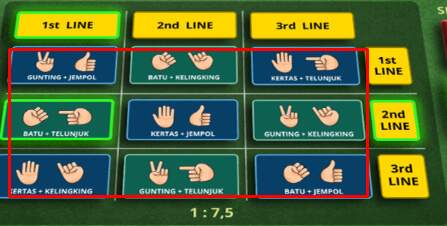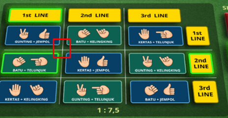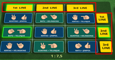 - Baris dan Kolom : Bettingan yang di tandai dengan "1st - 3rd Line" dimana anda melakukan betting untuk memilih paket kombinasi yang terdiri dari 3 jenis kombinasi 2 Dadu. Salah satu bettingan Dari paket kombinasi harus menang keduanya di adu melawan hasil keluaran dari masing" jenis dadunya.
